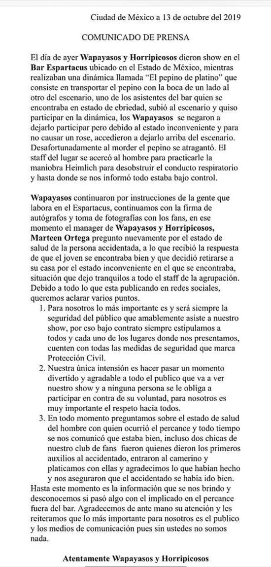 De acuerdo con un comunicado publicado en la página de Facebook de los Wapayasos (@wapayasos), el hombre no fue seleccionado para participar en la dinámica debido “al estado inconveniente” en que se encontraba, sin embargo, “para no causar un roce, accedieron a dejarlo arriba del escenario”.