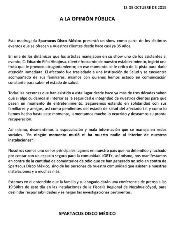 Spartacu’s Disco Club (@spartacusdiscomex) emitió un comunicado en el que señala que la persona involucrada en la dinámica es un cliente frecuente del lugar, a quien se le retiró de la pista para dar la atención necesaria y se le trasladó a una institución de salud.