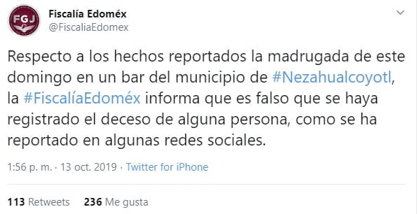 Nezahualcóyotl, Méx.- A través de un mensaje en su cuenta de Twitter, la Fiscalía de Justicia del Estado de México (@fiscaliaEdomex) informó que es falsa la información sobre el deceso de una persona en un bar del municipio de Nezahualcóyotl; Spartacu’s informó que se ha mantenido en contacto con familiares del cliente involucrado para conocer el estado de salud.